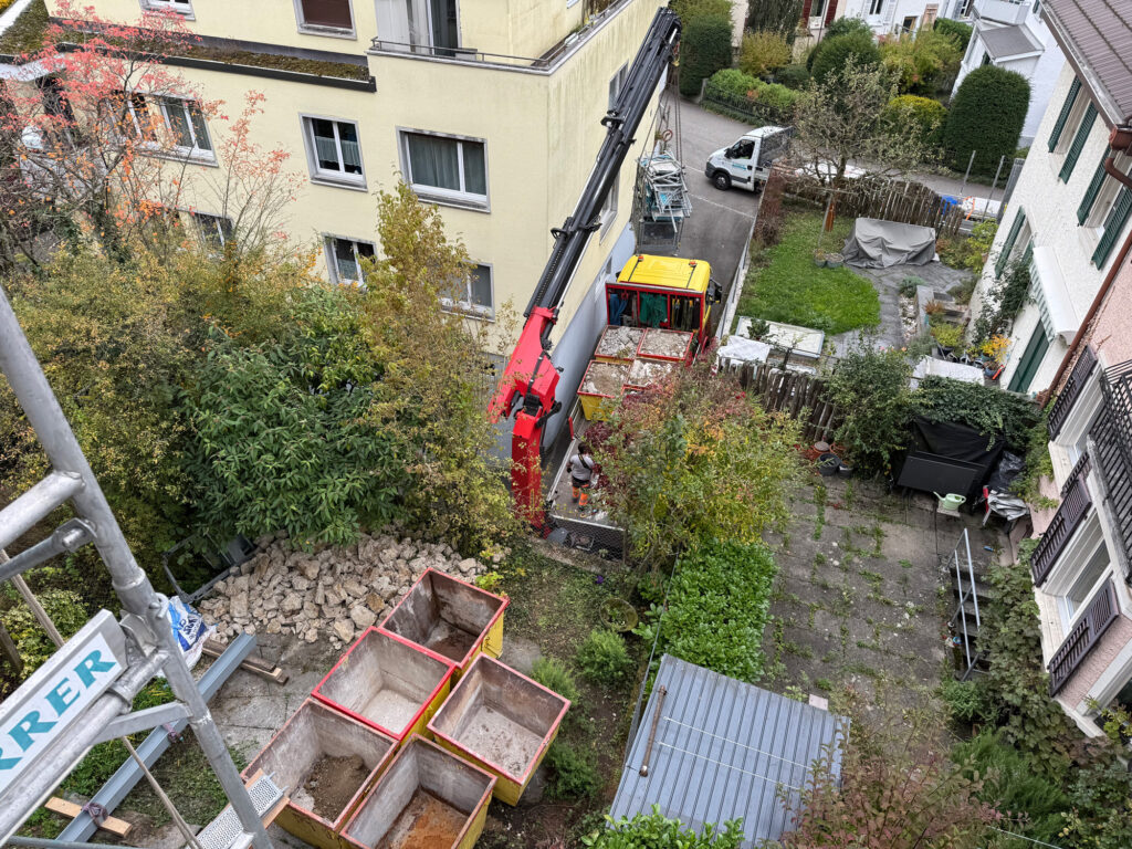 Für die neue Bodenplatte im Keller führten wir die Aushubarbeiten mit einem Elektrobagger aus. Gleichzeitig wurde eine Radonabdichtung eingebaut. Radon ist ein natürlich vorkommendes Edelgas aus dem Erdreich, das über Undichtigkeiten in Bodenplatten und Fugen in Gebäude eindringen kann. Ziel einer Radonabdichtung ist es, das Eindringen von Bodenluft dauerhaft zu verhindern.